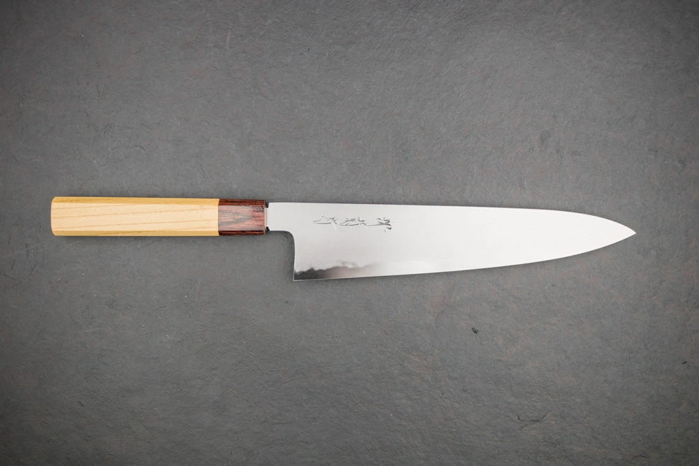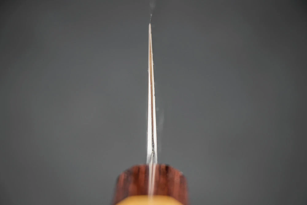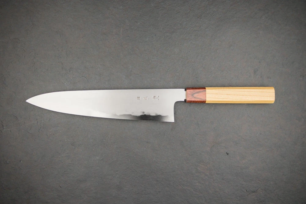 This particular line is a collaboration between Knifewear and Sakai Kikumori, a knife distributor in Sakai who represents Tanaka-san. We have asked Yoshikazu Tanaka to forge the blades and Ajioka san to sharpen. The soft, misty finish was also specially chosen by us. The blade is forged with Shirogami #2, a traditional high-carbon steel beloved by knife makers and chefs alike for its extreme sharpness and excellent edge retention.