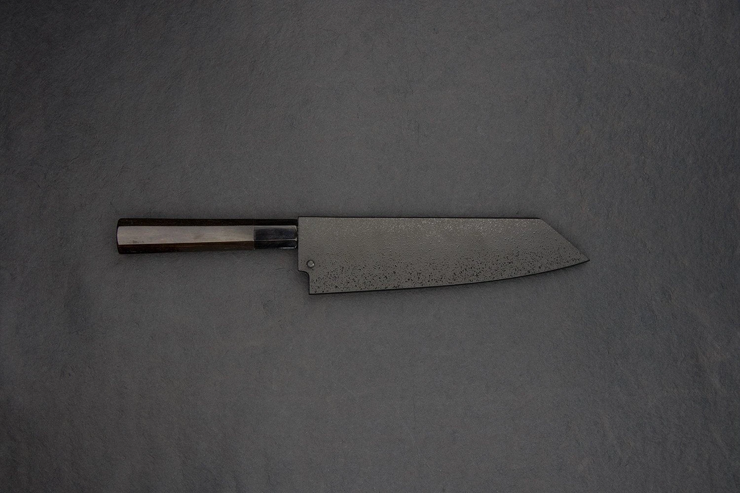 About the Shape – This is also a multi purpose knife, but with a slight vegetable bias. Santoku means ‘Three Virtues’ or ‘To solve Three Problems’. The virtues or problems are slicing, dicing and mincing. Santoku is usually found in 160mm – 190mm lengths. These are more and more popular in Western kitchens due to the unique shape and smaller easy to handle size.