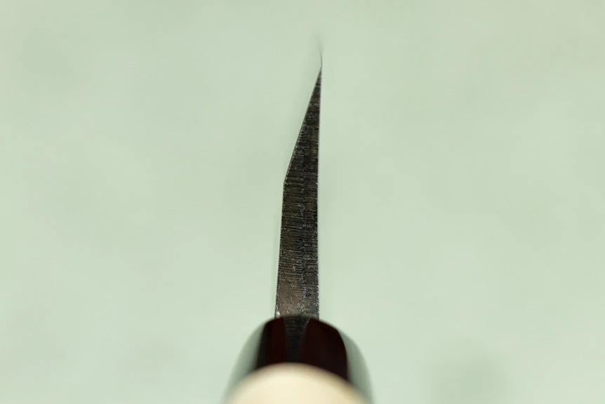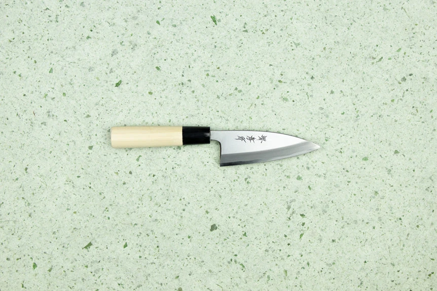 The Suigyu Kasumitogi is perfect for a young sushi chef or amateur home cook wanting to break into the world of sushi. Shirogami (white) carbon is pretty darn great. It’s super easy to sharpen, takes a brilliantly sharp edge, cuts like silk, and is very rugged for its hardness. Just keep it dry to avoid rust!