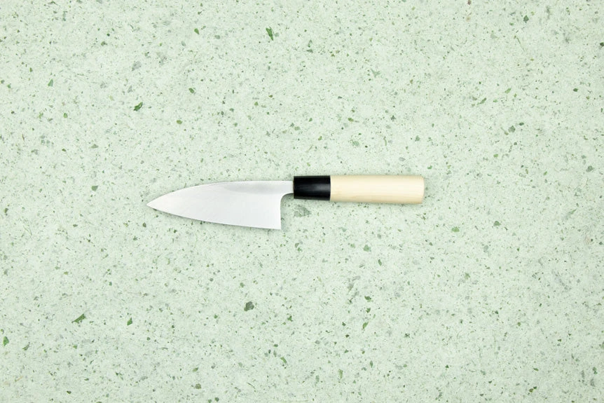 About the Shape –Deba means “short fat tooth” and this describes the shape of the knife. This is the first knife a sushi chef would use when preparing fish. It is used to fillet fish and butcher the boneless meat. The Deba is a traditional Japanese blade that is only sharpened on one side. This is called “single bevel.” Don’t let the shape and weight of a Deba fool you; they are nimble and precise. Choose the length of your Deba based on the size of fish you’ll be butchering most often.