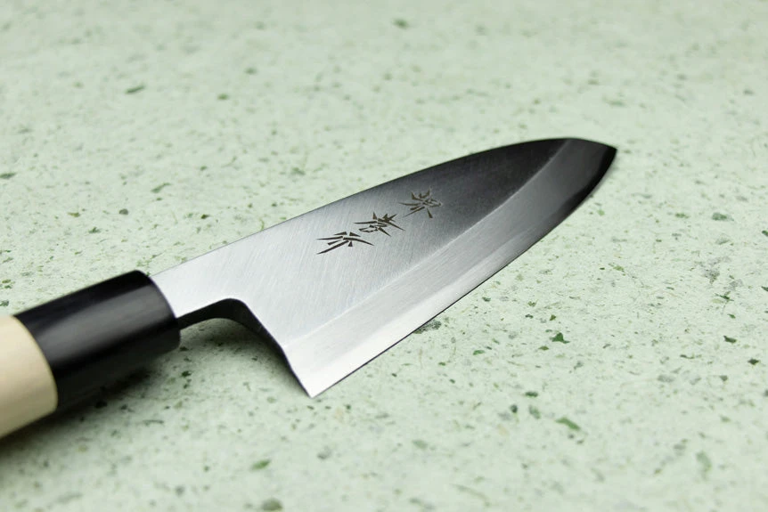 The Suigyu Kasumitogi is perfect for a young sushi chef or amateur home cook wanting to break into the world of sushi. Shirogami (white) carbon is pretty darn great. It’s super easy to sharpen, takes a brilliantly sharp edge, cuts like silk, and is very rugged for its hardness. Just keep it dry to avoid rust!