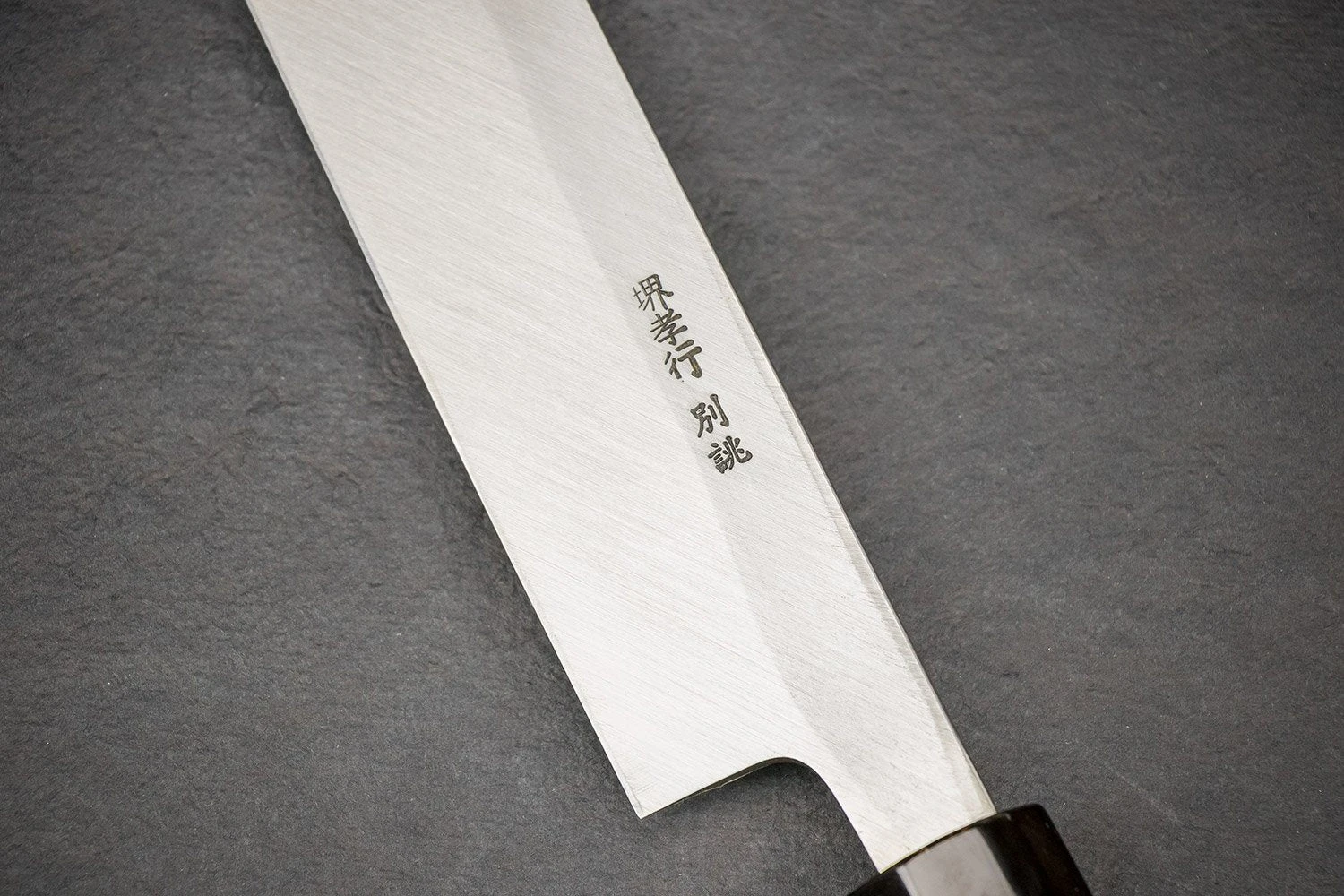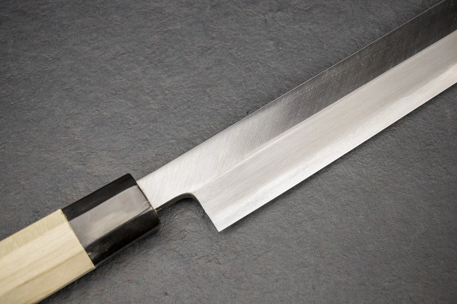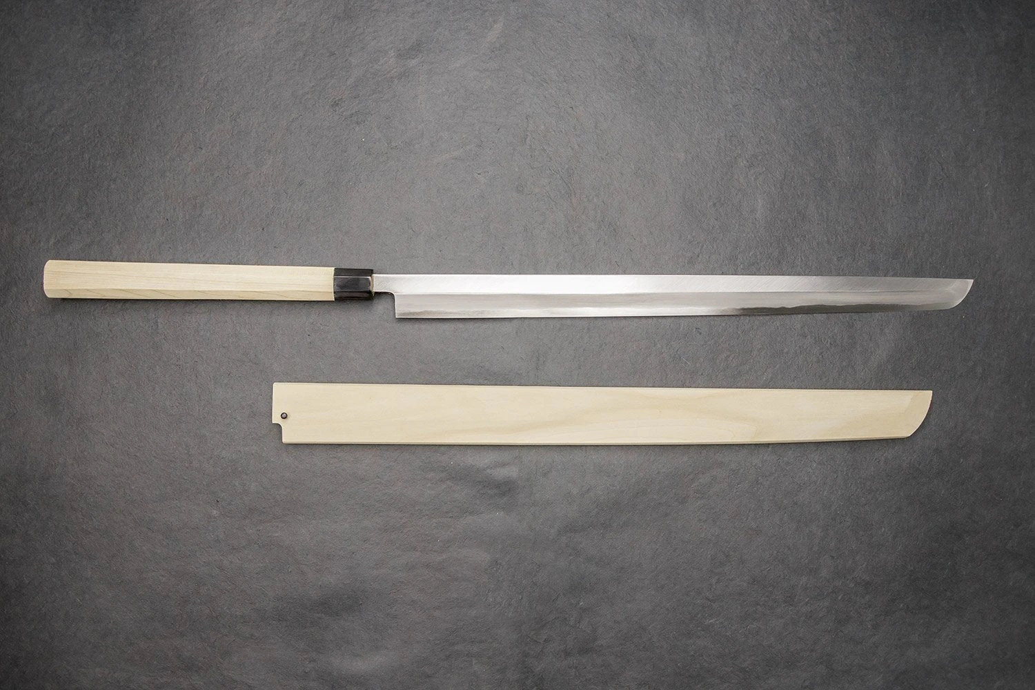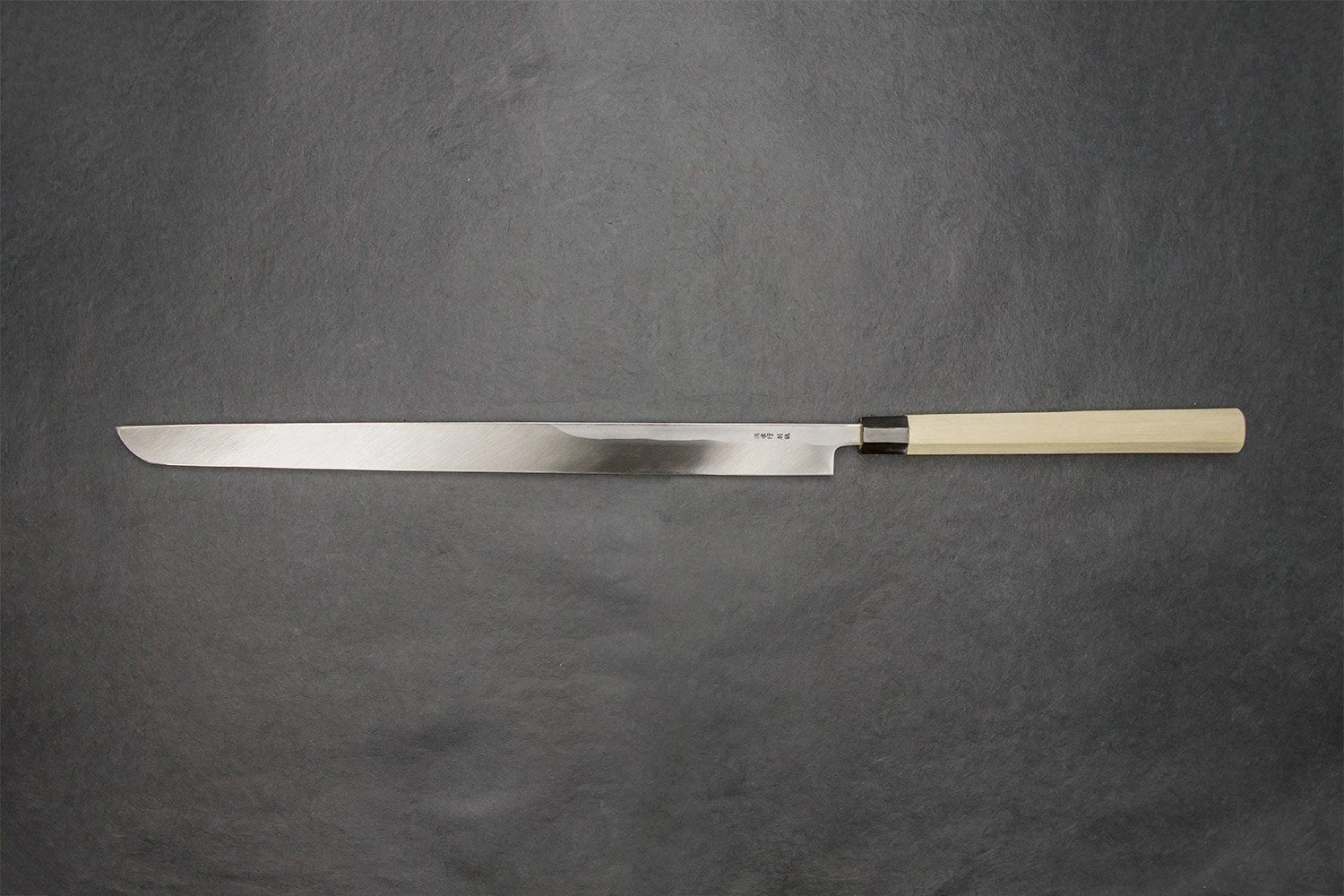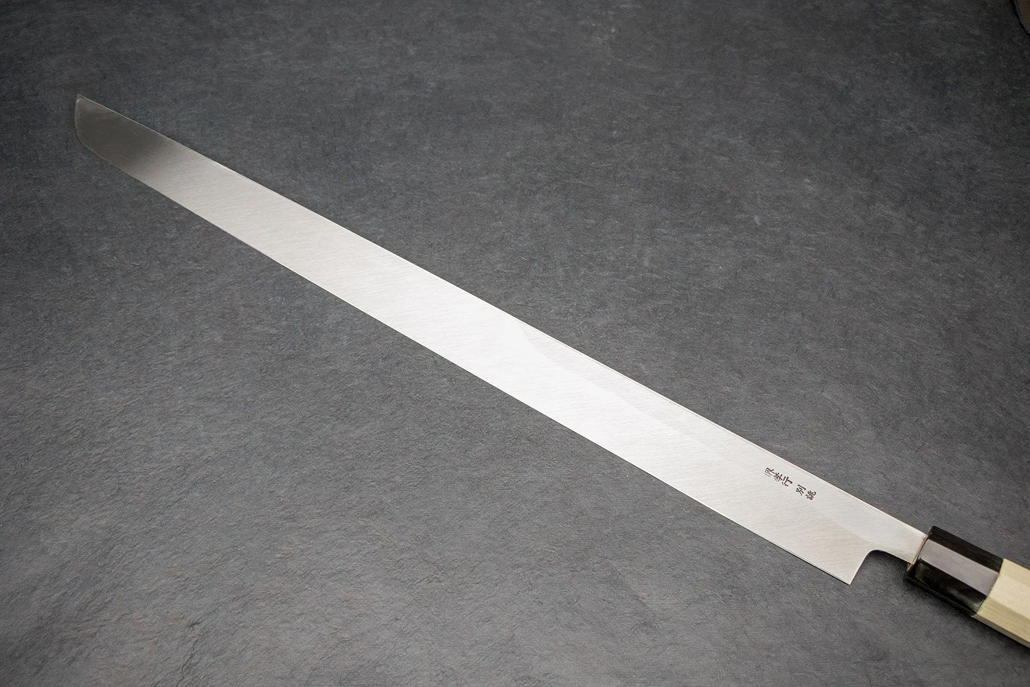 About the Shape –The maguro bocho or Tuna Knife is an extremely long, highly specialized knife used in Japan to fillet tuna and other large fish. It can fillet a tuna in a single cut. They are commonly found at fish markets in Japan, the largest of which is the Tsukiji fish market in Tokyo, for which they are often called oroshi-hocho (“wholesale knife”), as they are of little need elsewhere. We have been known to use our company maguro bocho “Maude” to slice iberico ham.
