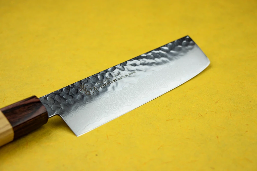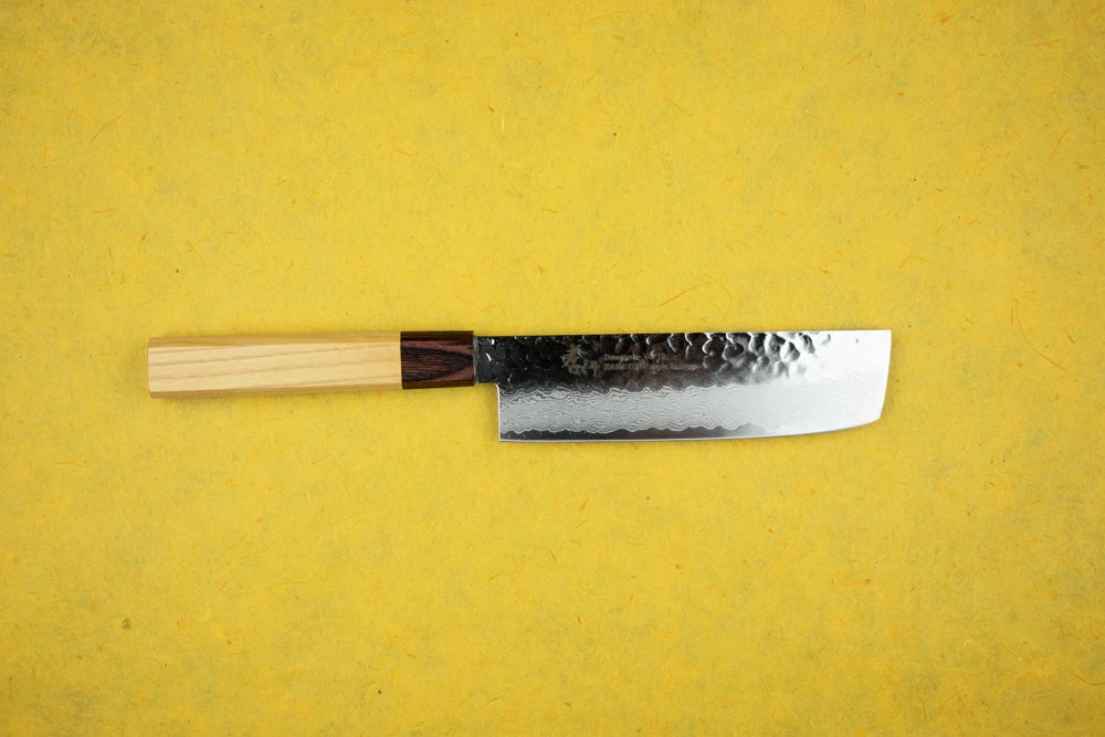About the Shape – A Nakiri is a vegetable knife. Underutilized in the Western kitchen, the Nakiri’s flat blade is meant for the push/pull chopping of vegetables. Since the entire flat edge of the knife kisses the cutting board at once, you won’t be turning the vegetable into an accordion. Accordion vegetables are still connected like a paper doll after you’re “done” cutting them. To truly understand the awesomeness of a Nakiri we recommend making onion soup your first night with the knife. The ease of chopping will blow you away.
