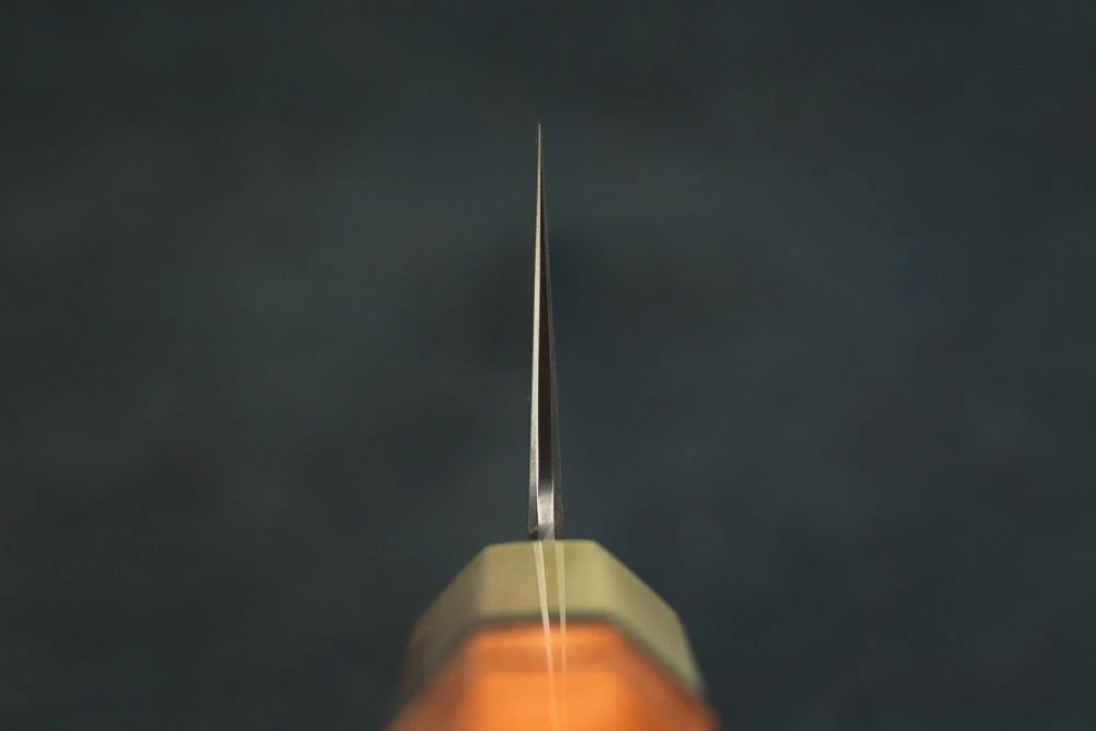 About the shape – Inspired by the profile of a traditional European chef knife, gyutos are a multi purpose knife with a slight meat cutting bias and “gyuto” even translates to “cow sword”. If you want one knife to do it all, This is it. The longer blade typically gives the blade a forward balance that allows it to work for you. While the blade would ideally by slid forward or back while cutting, they are also great for folks that prefer to ‘rock’ their knife while cutting.