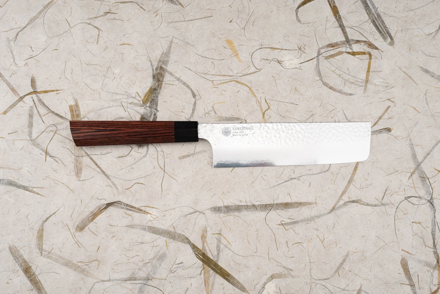 ‘About the Shape – A Nakiri is a vegetable knife. Under utilized in the Western kitchen, the Nakiri’s flat blade is meant for the push/pull chopping of vegetables. Since the entire flat edge of the knife kisses the cutting board at once, you wont be turning the vegetable into an accordion. Accordion vegetables are still connected like a paper doll after you’re “done” cutting them. To truly understand the awesomeness of a Nakiri we recommend making onion soup your first night with the knife. The ease of chopping will blow you away.