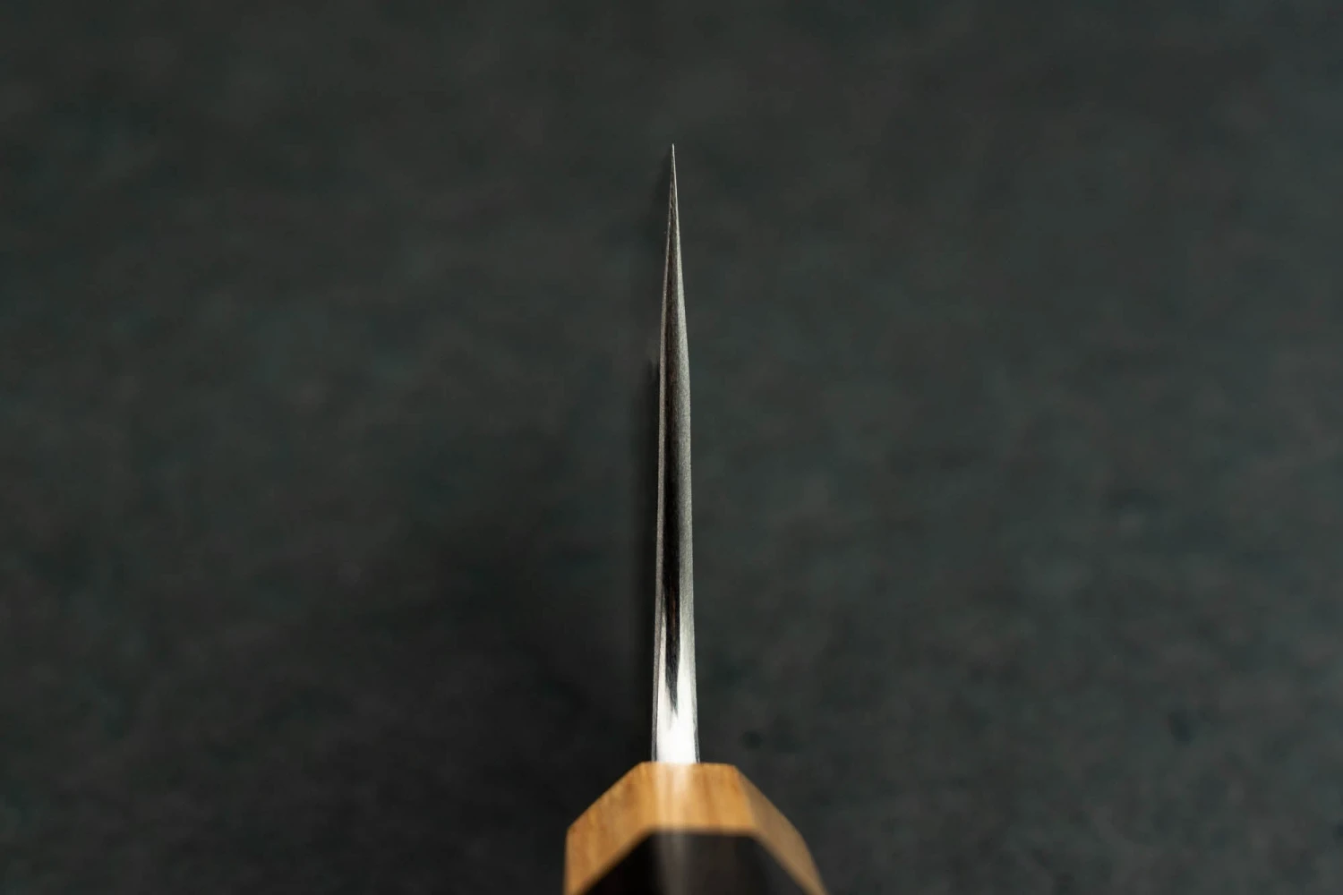 Using Aogami Super steel clad with stainless steel cladding, Tank strikes a great balance between high performance and low maintenance. The blade is left black, as a home forging blacksmith tinkerer might do, but spine and choil are mirror polished to add some refinement. It looks really cool. *Handle may vary from shipment to shipment. The first photo shown is handle we’ve gotten on the last two shipments.