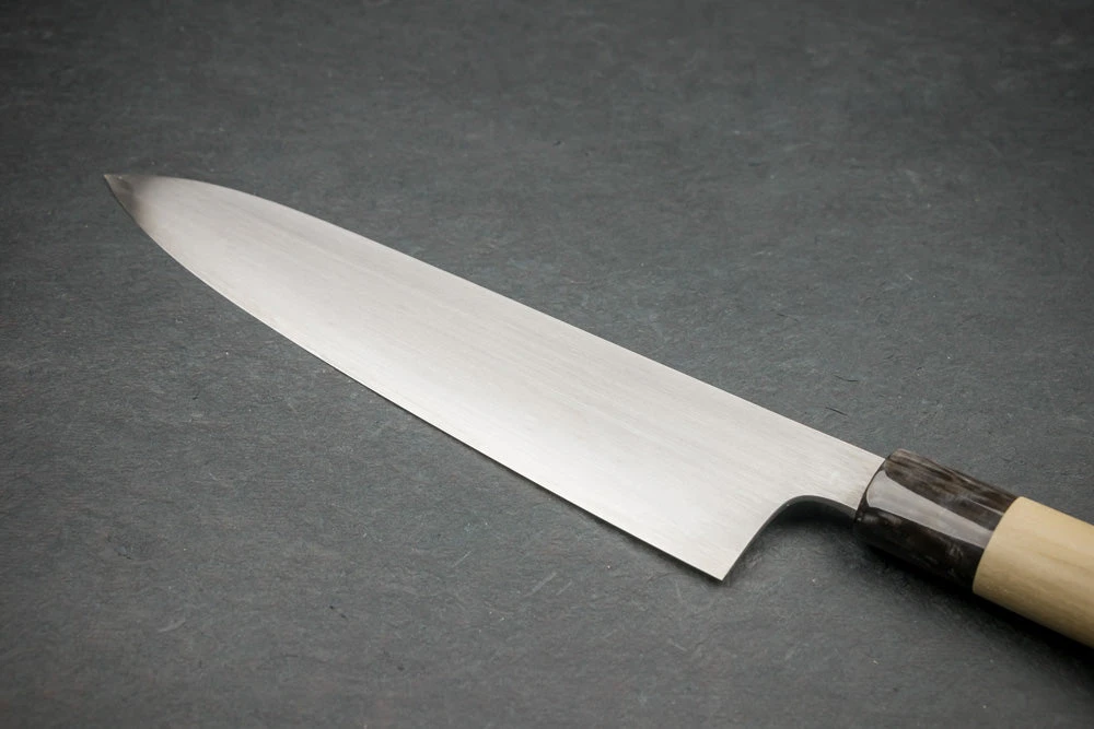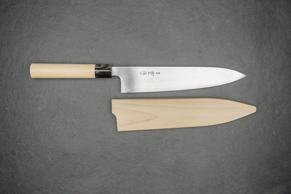 About the Shape – Inspired by the profile of a traditional European chef knife, Gyutos are a multi-purpose knife with a slight meat cutting bias. “Gyuto” translates to “cow sword.” If you want one knife to do it all, This is it. Starting at 180mm, Gyutos can reach the ridiculously long (and awesome) 370mm. For the at-home or professional cook, we recommend a Gyuto which measures between 210mm and 270mm long.