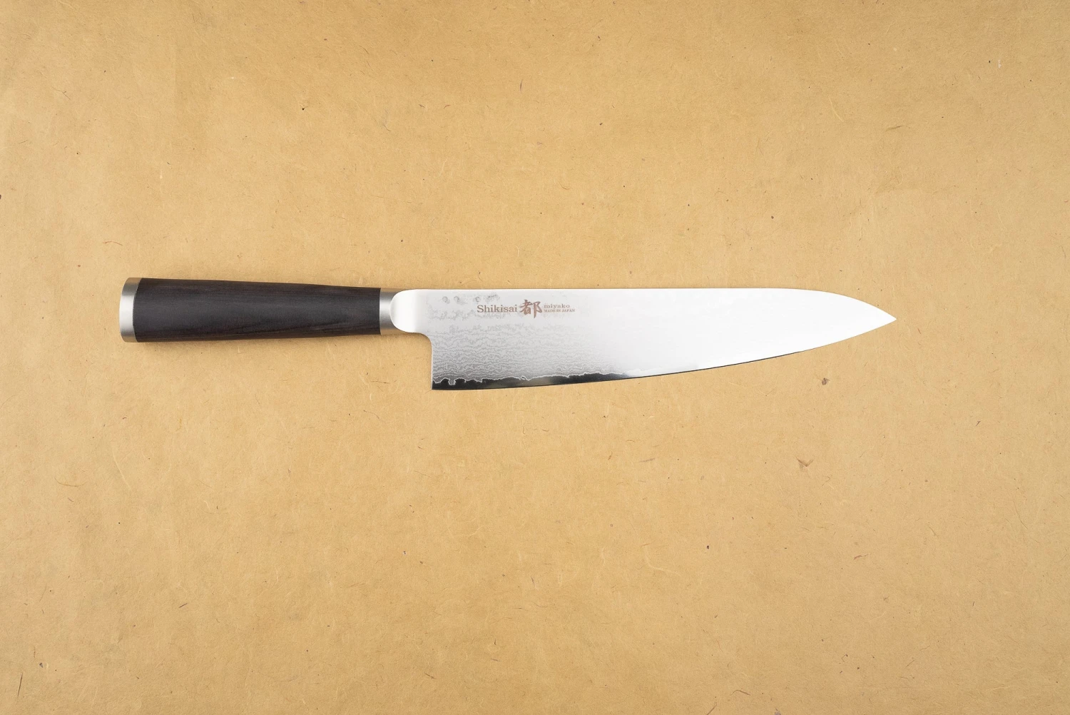 The Shikisai Miyako is an elegant choice for both chefs and home cooks. AUS-8 stainless steel is low maintenance, keeps a great edge, and is more rugged than most Japanese steels. The 33-layer damascus finish makes for a stunning piece, finished with a weighty, confident pakkawood handle. Perfection!