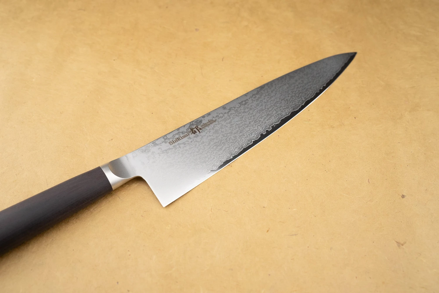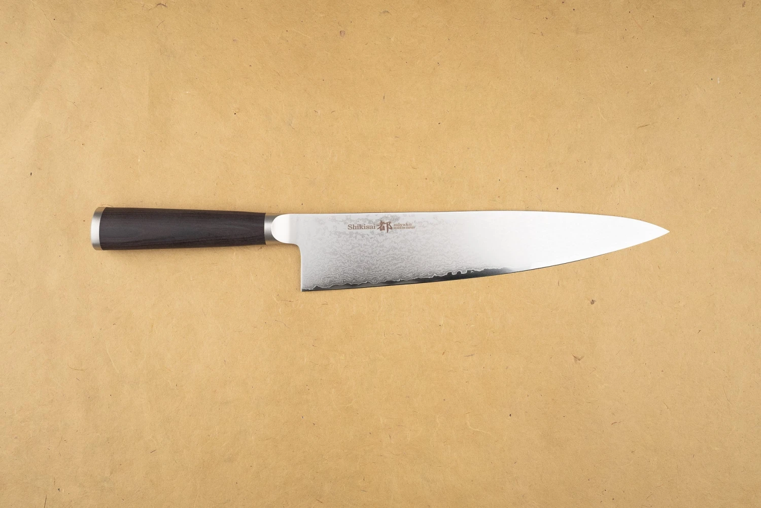 The Shikisai Miyako is an elegant choice for both chefs and home cooks. AUS-8 stainless steel is low maintenance, keeps a great edge, and is more rugged than most Japanese steels. The 33-layer damascus finish makes for a stunning piece, finished with a weighty, confident pakkawood handle. Perfection!
