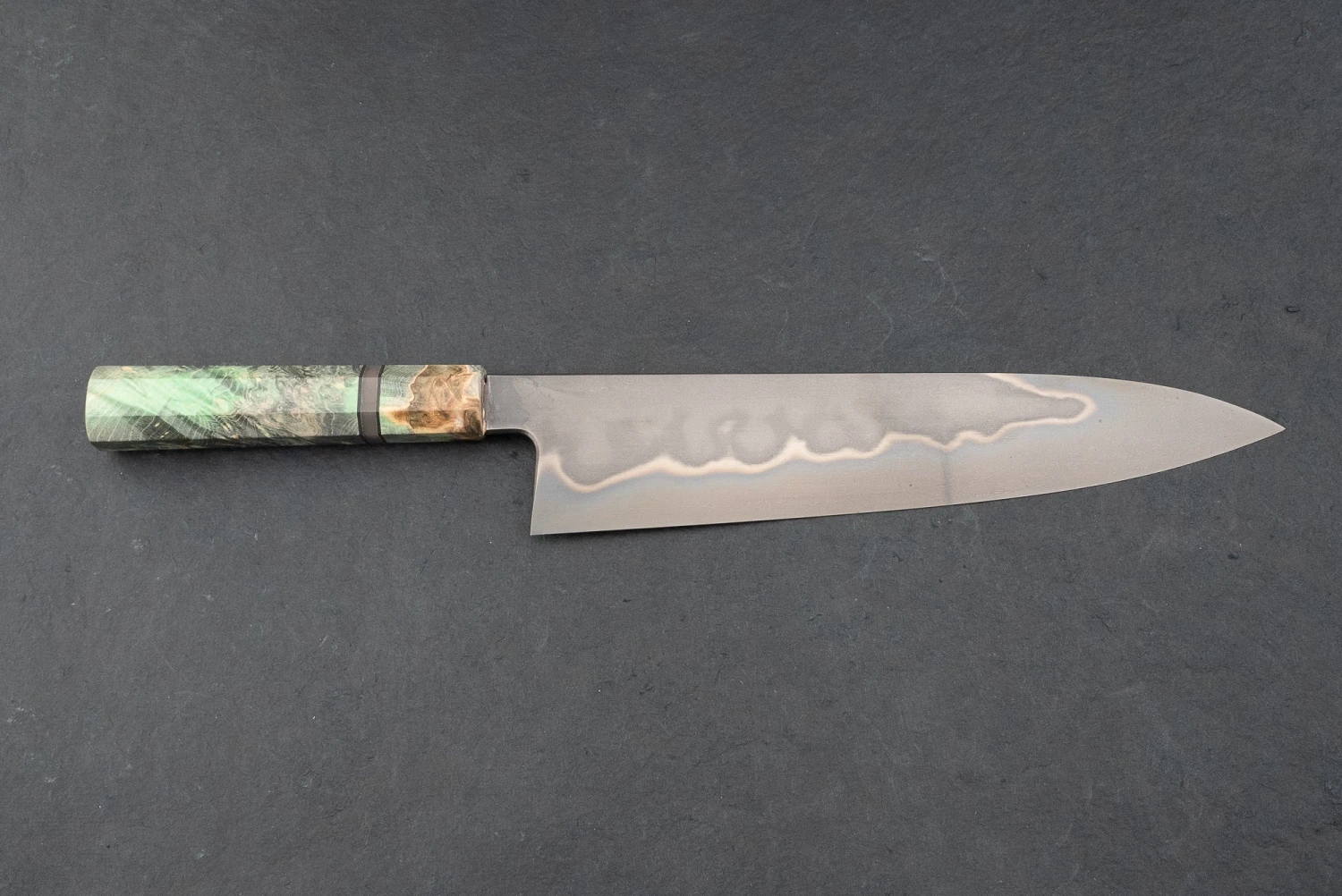 The outer layer, or “Jigane”, is made with Nantetsu soft steel and a variety of other soft steels (i.e. SK3), then folded over and over. The “core” steel is made with white 2 and blue 2 Damascus, for an absolutely stunning cutting edge. This is a very unique piece of art that no other knife can compare to.