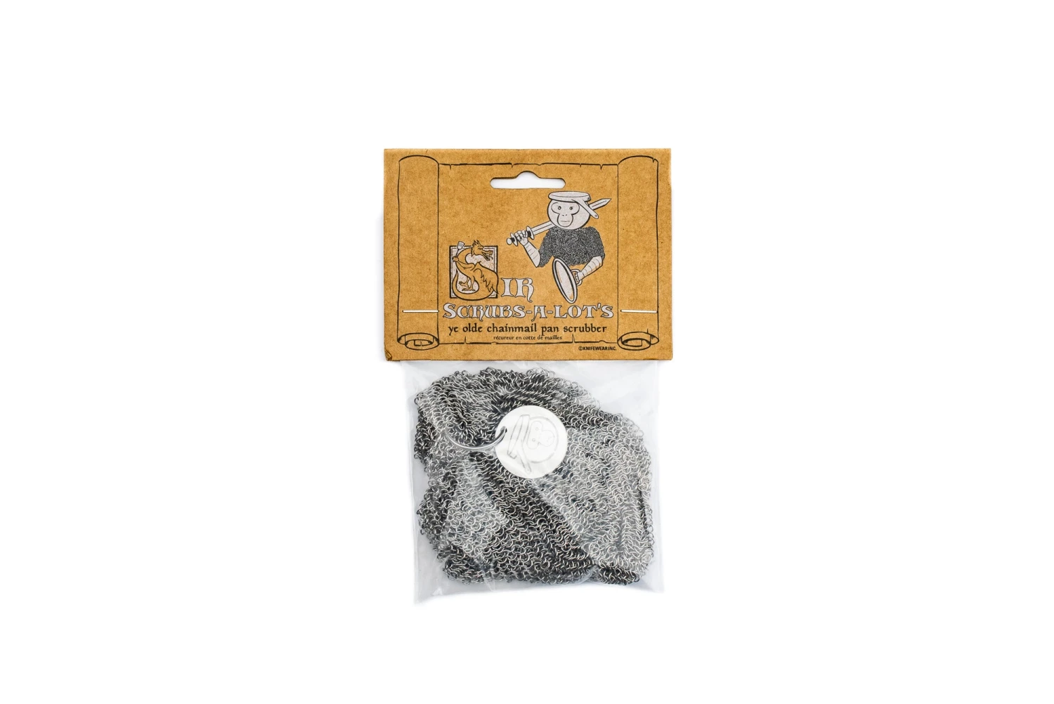 Sir Scrubs-A-Lot: vanquisher of stains, defender of pans, and protector of the kitchen realms! The Knifewear Chainmail Pan scrubber has been tested extensively on abused cast iron, stainless and carbon steel pots and pans; Sir Scrubs-A-Lot came to the rescue, restoring cleanliness and peace at every turn. Its fine chainmail texture scrubs away the toughest burnt-on gunk and grime without damaging your precious seasoning! It even works on glass and enamel.