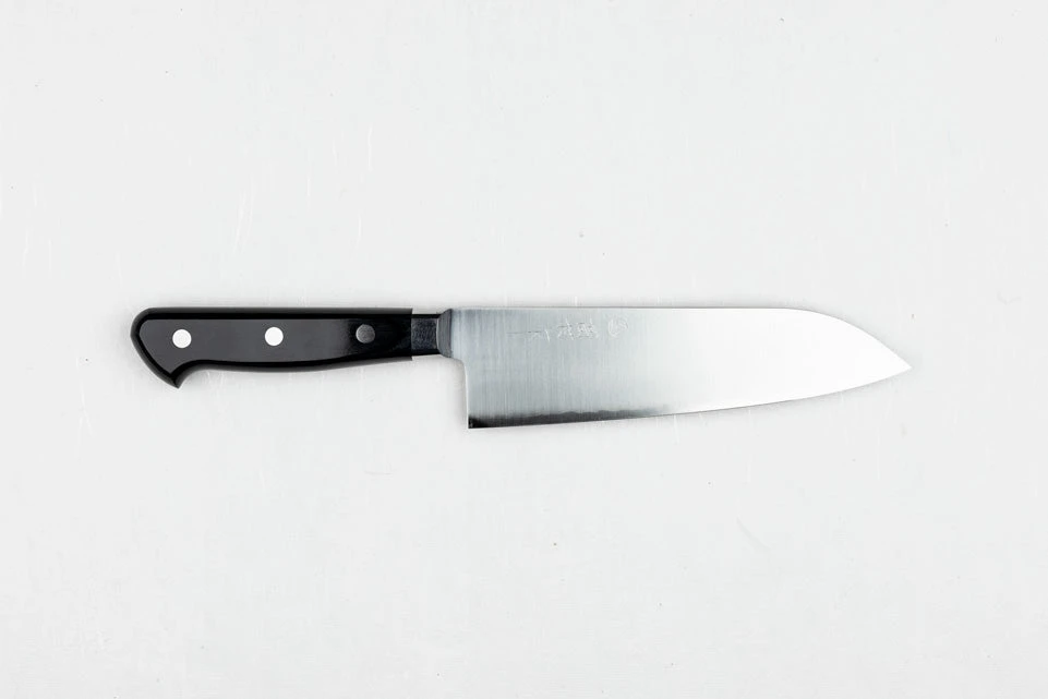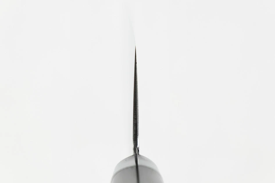 About the shape – Santoku means ‘Three Virtues’ or ‘To solve Three Problems’. The three virtues are meat, fish and vegetables, or slicing, dicing and mincing depending on your interpretation. This means that the Santoku is an all-around knife, suitable for the amateur home cook and the professional chef alike. The heigh means good clearance for big hands, while the relatively short blade can be wielded by anyone.