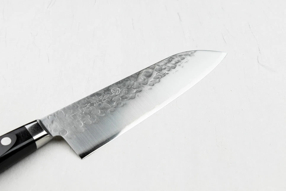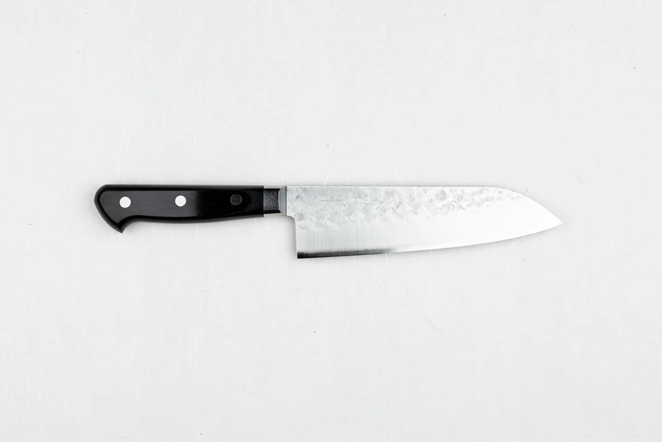 About the shape – Santoku means ‘Three Virtues’ or ‘To solve Three Problems’. The three virtues are meat, fish and vegetables, or slicing, dicing and mincing depending on your interpretation. This means that the Santoku is an all-around knife, suitable for the amateur home cook and the professional chef alike. The heigh means good clearance for big hands, while the relatively short blade can be wielded by anyone.