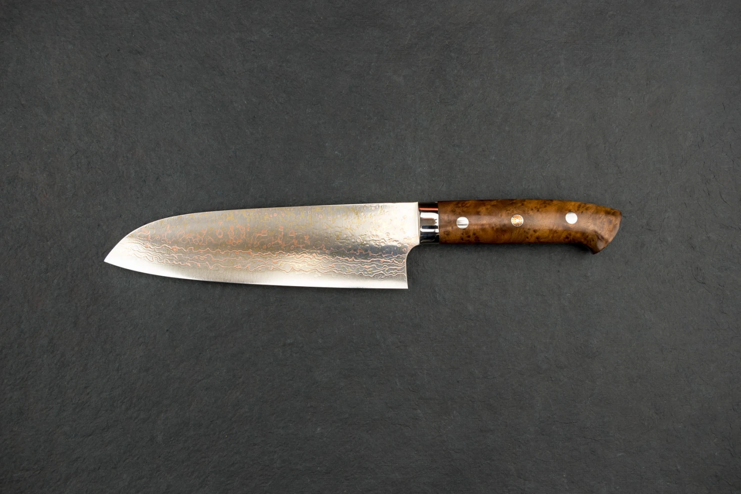 About the shape – Santoku means ‘Three Virtues’ or ‘To solve Three Problems’. The three virtues are meat, fish and vegetables, or slicing, dicing and mincing depending on your interpretation. This means that the Santoku is an all-around knife, suitable for the amateur home cook and the professional chef alike. The heigh means good clearance for big hands, while the relatively short blade can be wielded by anyone.
