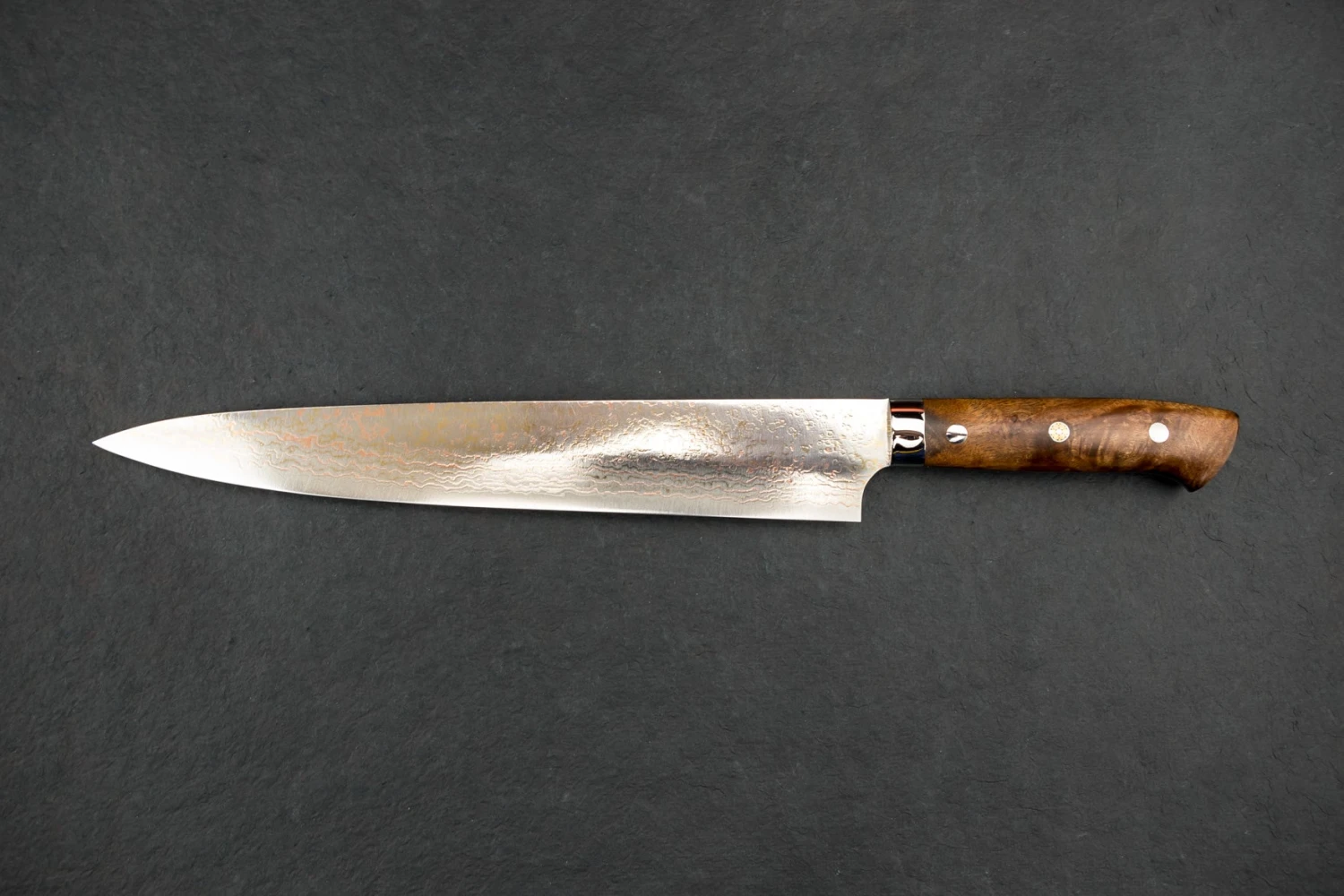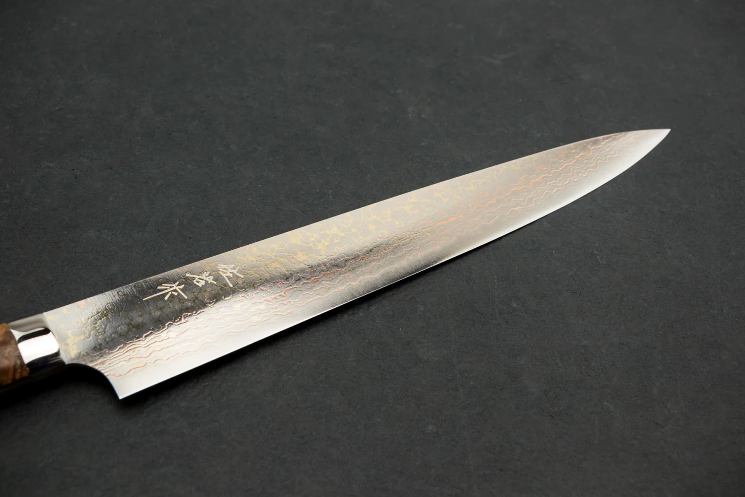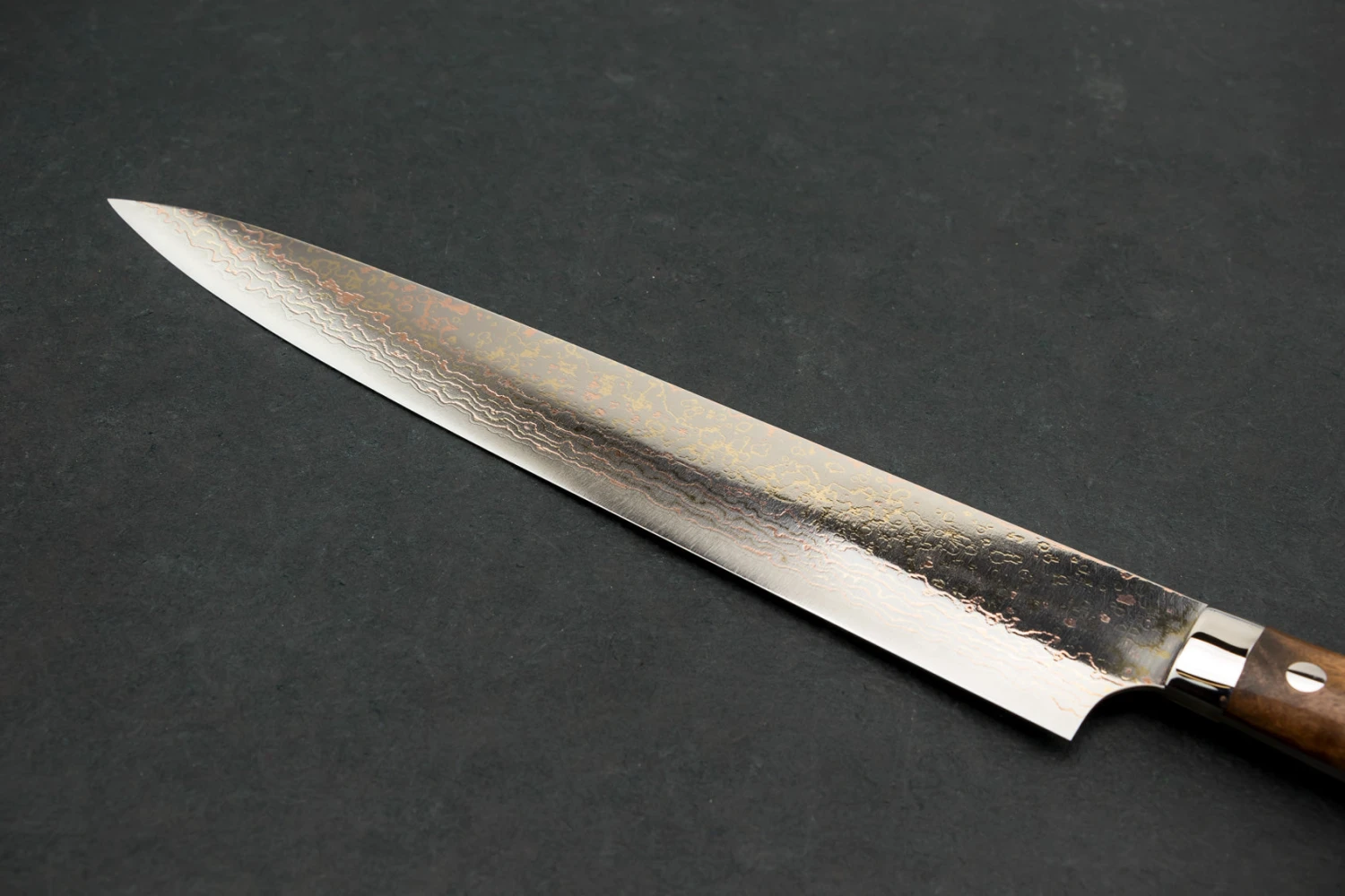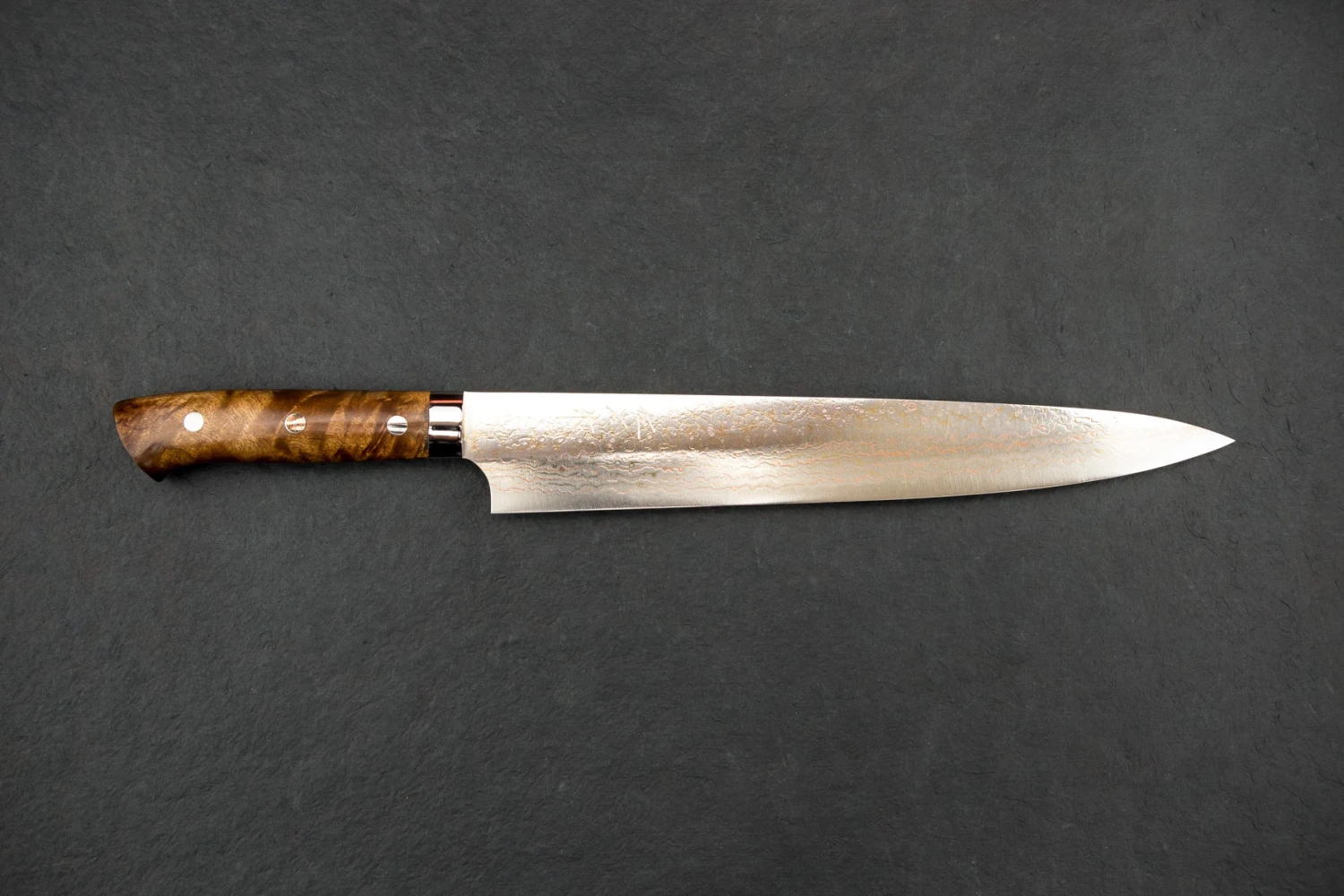 About the Shape – “Sujihiki” translates to “Flesh Slicer” and it does exactly what the name suggests, perfect for carving and slicing roasts, turkey, raw meats, fish, and all other proteins and the extended blade length allows you to slice with one long stroke, instead of sliding the knife back and forth in a sawing motion. Making clean slices of brisket or ultra thin applications like Carpaccio a breeze to execute.