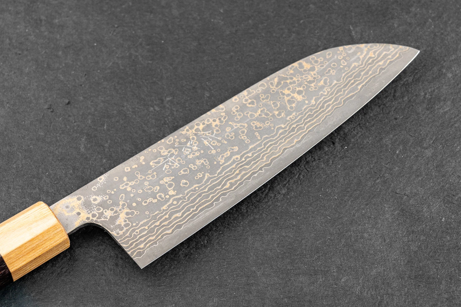 About the shape – Santoku means ‘Three Virtues’ or ‘To solve Three Problems’. The three virtues are meat, fish and vegetables, or slicing, dicing and mincing depending on your interpretation. This means that the Santoku is an all-around knife, suitable for the amateur home cook and the professional chef alike. The heigh means good clearance for big hands, while the relatively short blade can be wielded by anyone.