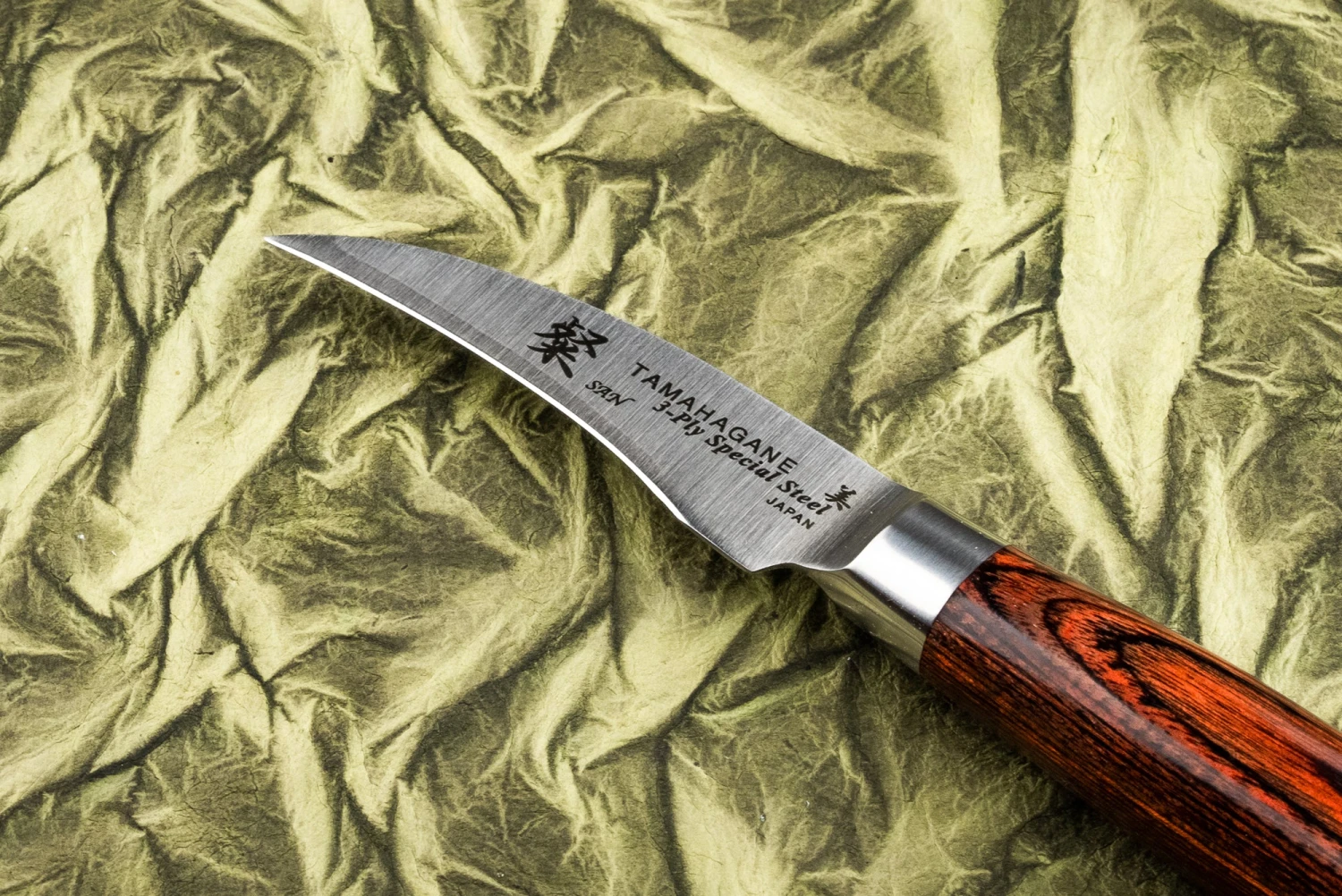 This series from Tamahagane is made from VG5 stainless steel. Similar to its sibling, VG10, VG5 keeps a great edge but VG5 is more durable and easier to sharpen than other Japanese stainless steels. This makes it perfect for giving to folks who may be harder on their knives, or for use in a commercial kitchen where someone else might be borrowing your knife. The layered Micarta handle is both gorgeous and super durable.