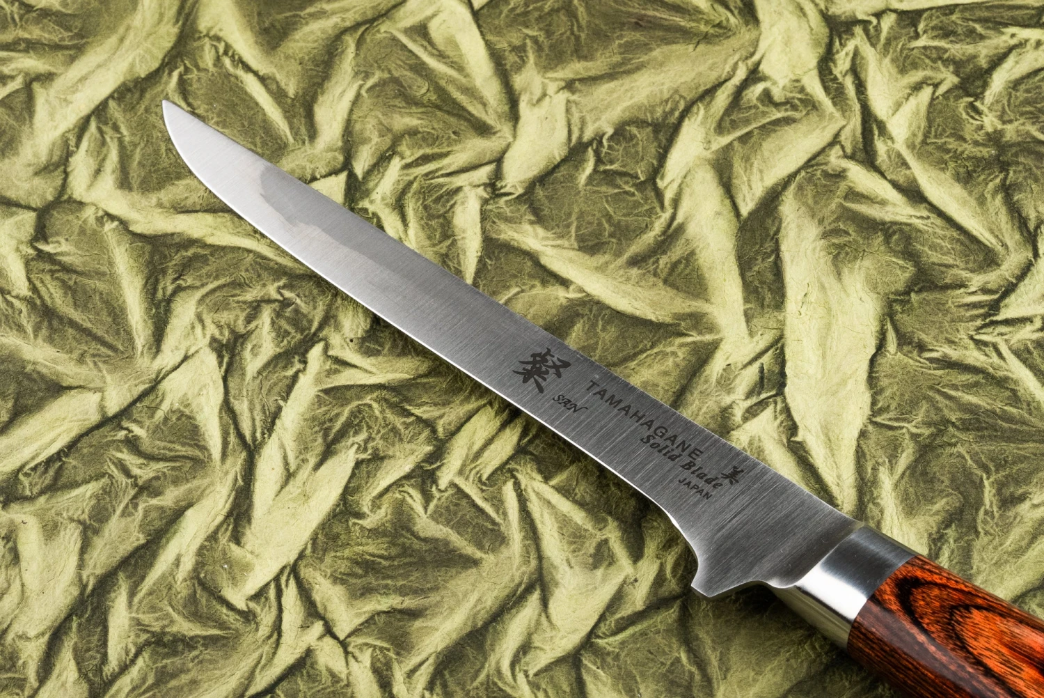 This series from Tamahagane is made from VG5 stainless steel. Similar to its sibling, VG10, VG5 keeps a great edge but VG5 is more durable and easier to sharpen than other Japanese stainless steels. This makes it perfect for giving to folks who may be harder on their knives, or for use in a commercial kitchen where someone else might be borrowing your knife. The layered Micarta handle is both gorgeous and super durable.