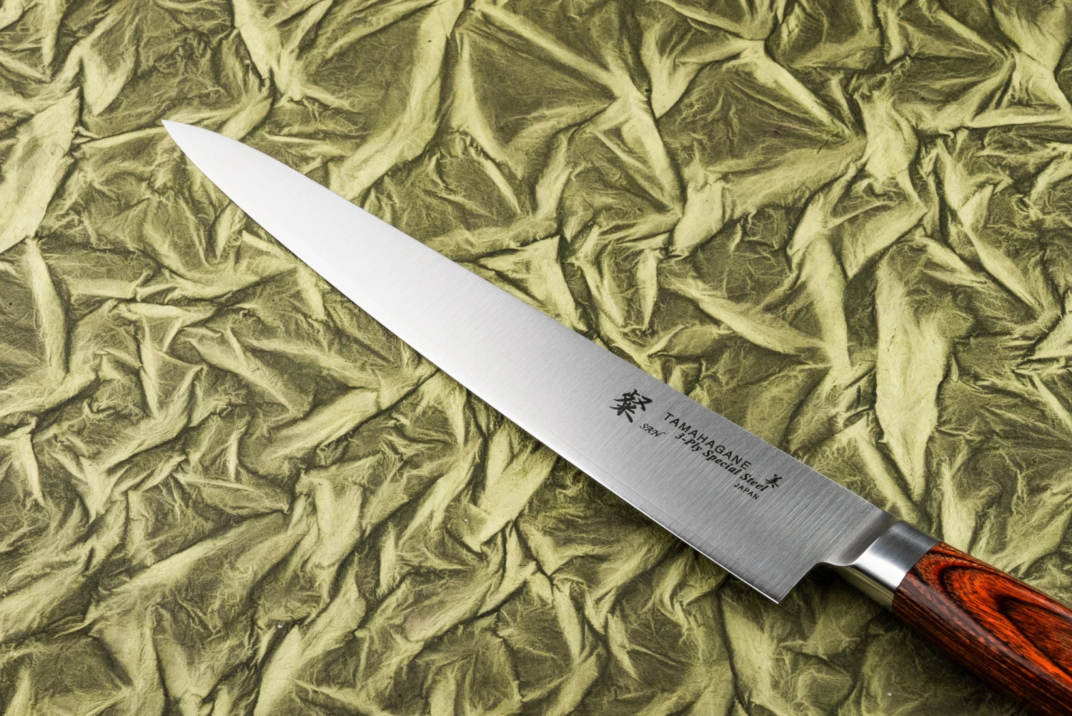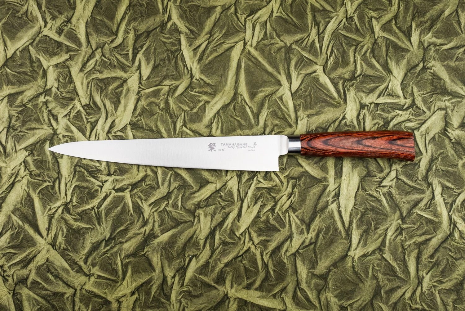 This series from Tamahagane is made from VG5 stainless steel. Similar to its sibling, VG10, VG5 keeps a great edge but VG5 is more durable and easier to sharpen than other Japanese stainless steels. This makes it perfect for giving to folks who may be harder on their knives, or for use in a commercial kitchen where someone else might be borrowing your knife. The layered Micarta handle is both gorgeous and super durable.