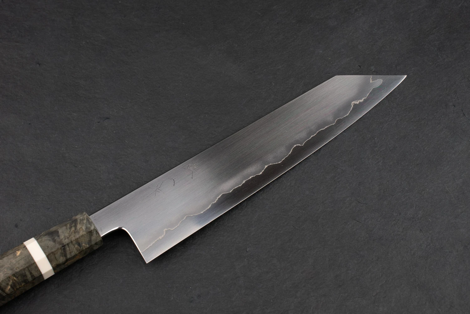About the Shape – Inspired by the profile of a traditional European chef knife, Gyutos are a multi purpose knife with a slight meat cutting bias. “Gyuto” translates to “cow sword.” If you want one knife to do it all, This is it. Starting at 180mm, Gyutos can reach the ridiculously long (and awesome) 370mm. For the at-home or professional cook, we recommend a Gyuto which measures between 210mm and 270mm long.