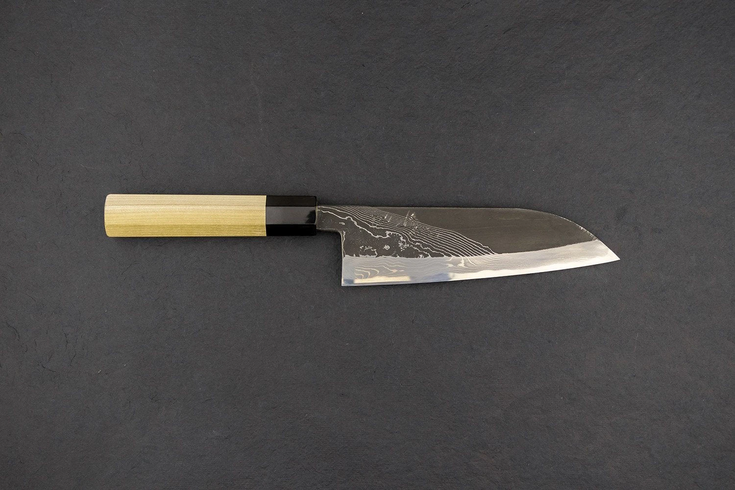 About the Tsukasa Hinoura River Jump – Tsukasa Hinoura represents the third generation of his family‘s forging tradition. As a young craftsman, his role models were Nagashima and Shigeyoshi Iwasaki of Sanjo. They enjoy an excellent reputation in Echigo and have done a great deal to advance the knife maker’s art in Sanjo. Tsukasa Hinoura, born in 1956, works in Sanjo in Niigata Prefecture, has been practicing his trade for 33 years. His blades are known for a refined and long lived edge.