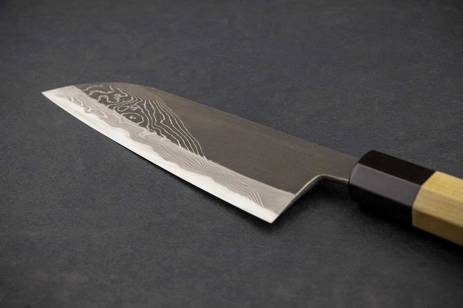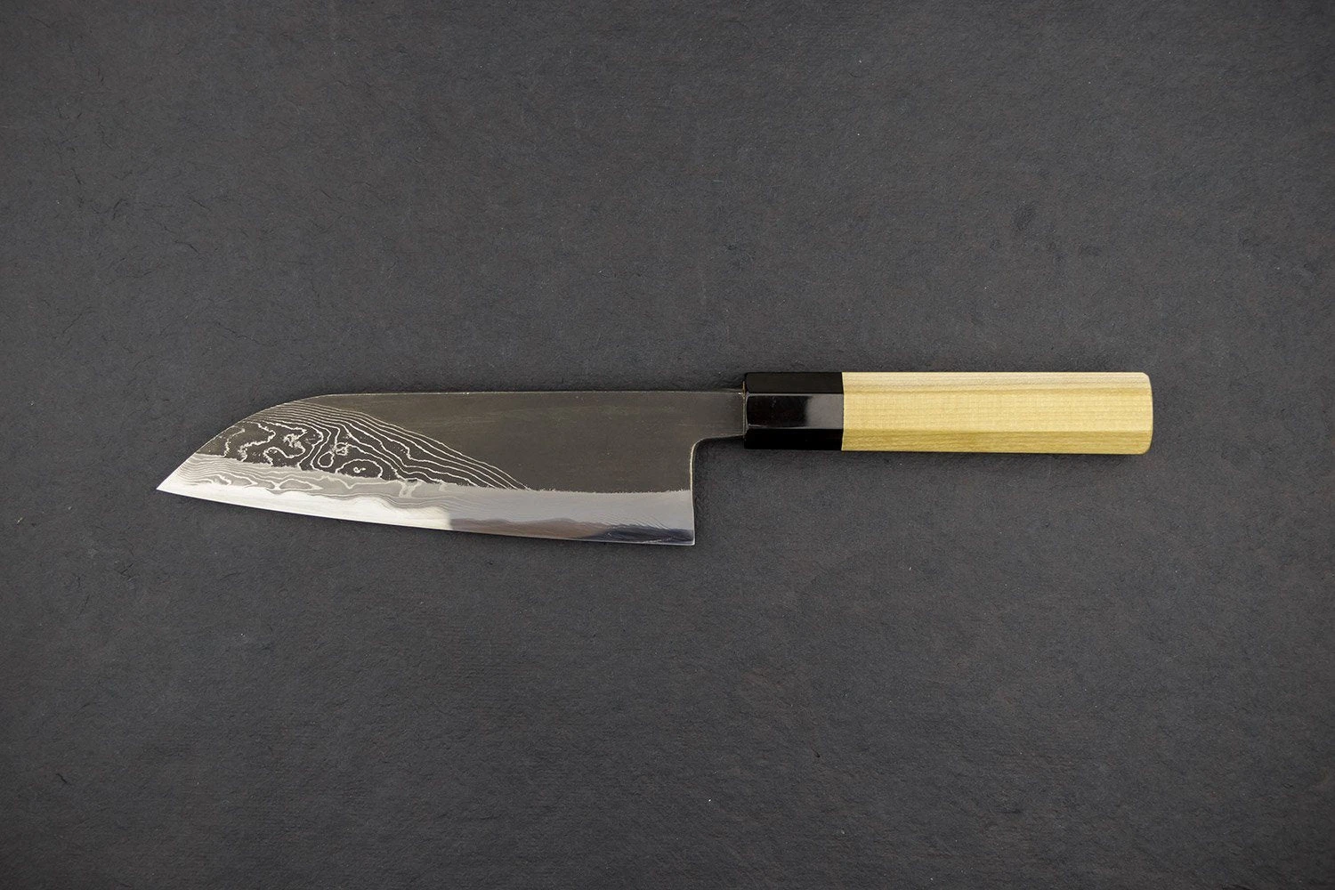 Hinoura san consciously rejects the prefabricated Damascus steel blanks, referred to as “sekisouk-ko”, commonly used in Japan. Many of the country’s knife makers and industrial manufactures that produce Damascus blades use this “instant recipe”, but neglect to make this clear to customers.