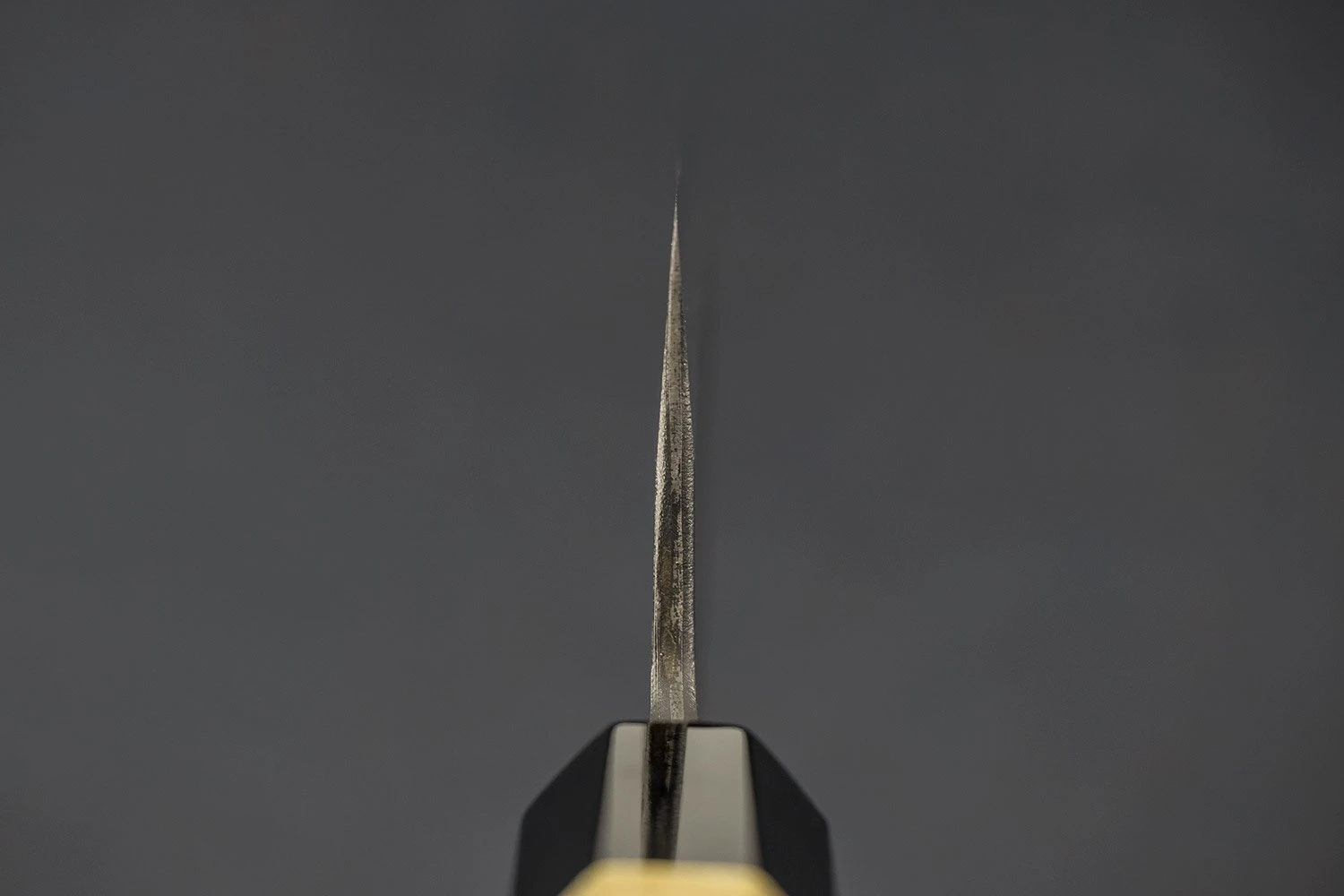 Each knife in the series “River Jump” is a one of a kind example of the Japanese knife making art. Hinoura san is among the world’s few knife makers who are skilled in the time honoured Damascus techniques involving torsion. With river jump, he has taken the method even further. By means of torsion, he combines a multi layered Damascus bar with solid mono steel bar. The result is a blade of extraordinary beauty, in which the river like flow of the Damascus surface alternates with the peace of a perfectly even surface -animated and static elements in perfect harmony.