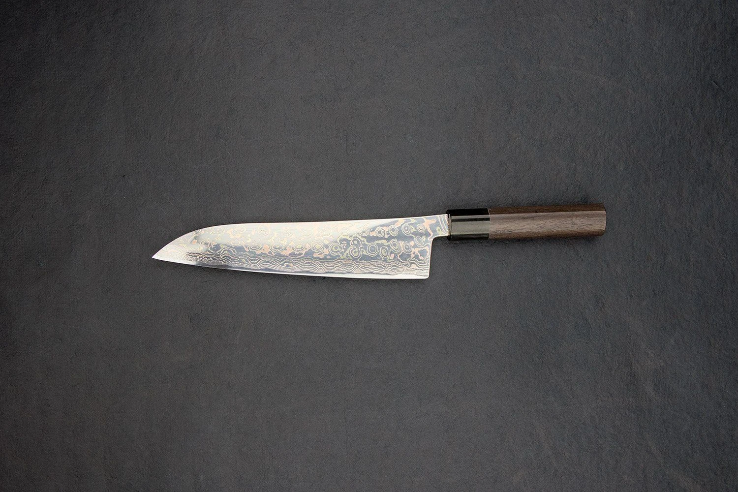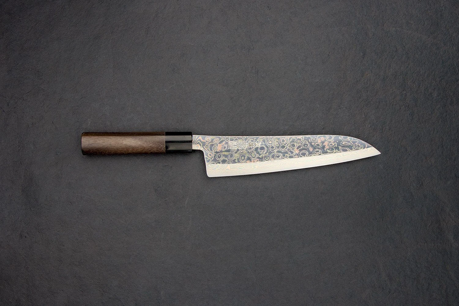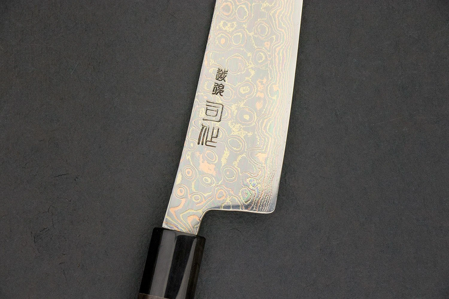 Seriously. Look at this blade. Hinoura-san is a true artist. By layering copper and brass into his cladding steel, he has created this crazy three-tone Damascus pattern. Hinoura-san is the only blacksmith to win the award for top knife two years in a row at the Seki Custom Knife Show. Both times were for his incredibly distinct-looking Damascus steel.