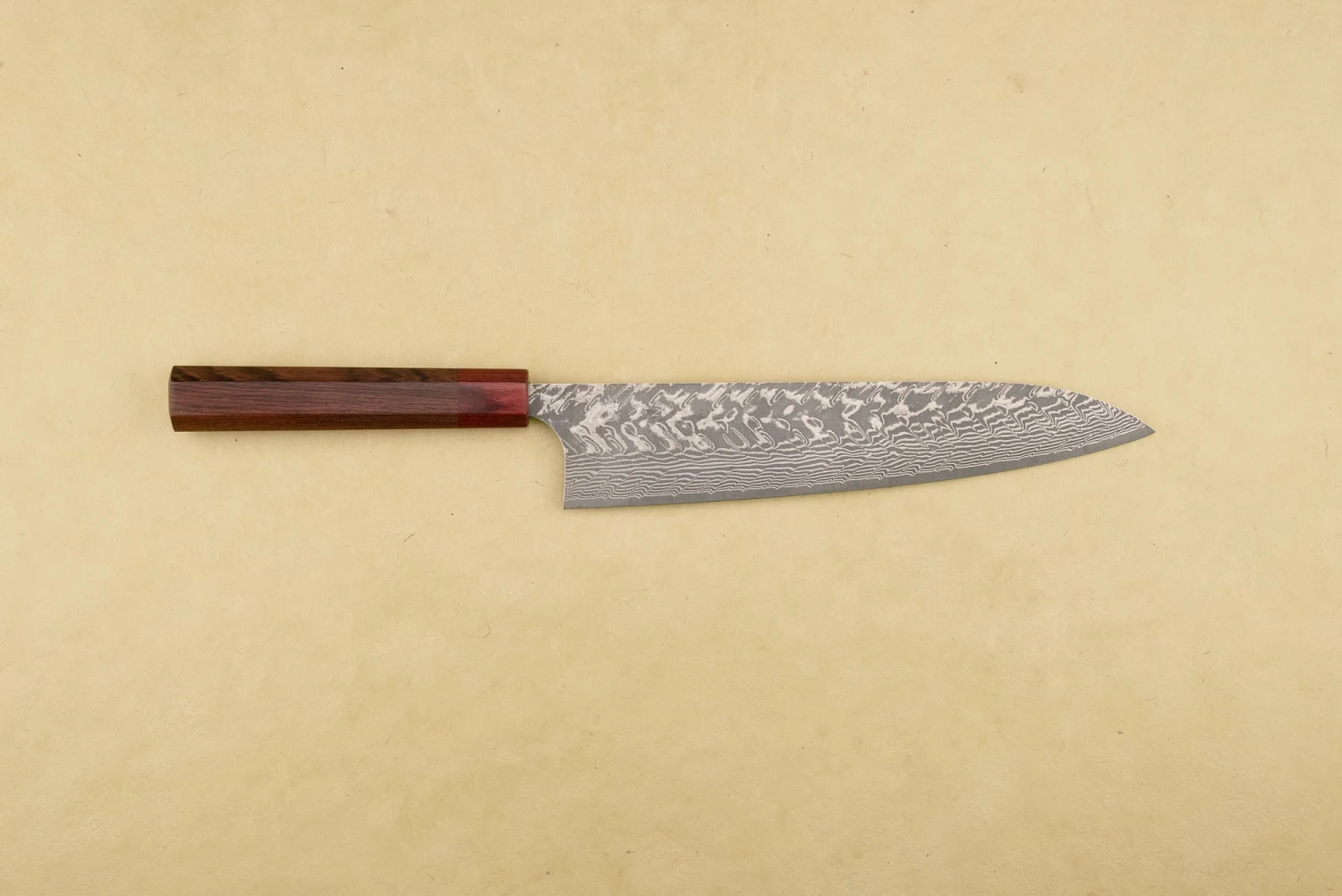 About the Shape – Inspired by the profile of a traditional European chef knife, Gyutos are a multi-purpose knife with a slight meat cutting bias. “Gyuto” translates to “cow sword.” If you want one knife to do it all, This is it. Starting at 180mm, Gyutos can reach the ridiculously long (and awesome) 370mm. For the at-home or professional cook, we recommend a Gyuto which measures between 210mm and 270mm long.