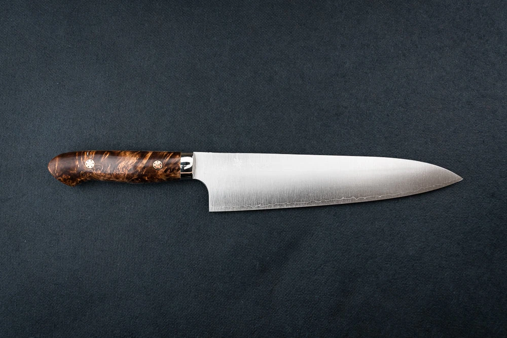 About the Shape – Inspired by the profile of a traditional European chef knife, Gyutos are a multi purpose knife with a slight meat cutting bias. “Gyuto” translates to “cow sword.” If you want one knife to do it all, This is it. Starting at 180mm, Gyutos can reach the ridiculously long (and awesome) 370mm. For the at-home or professional cook, we recommend a Gyuto which measures between 210mm and 270mm long.