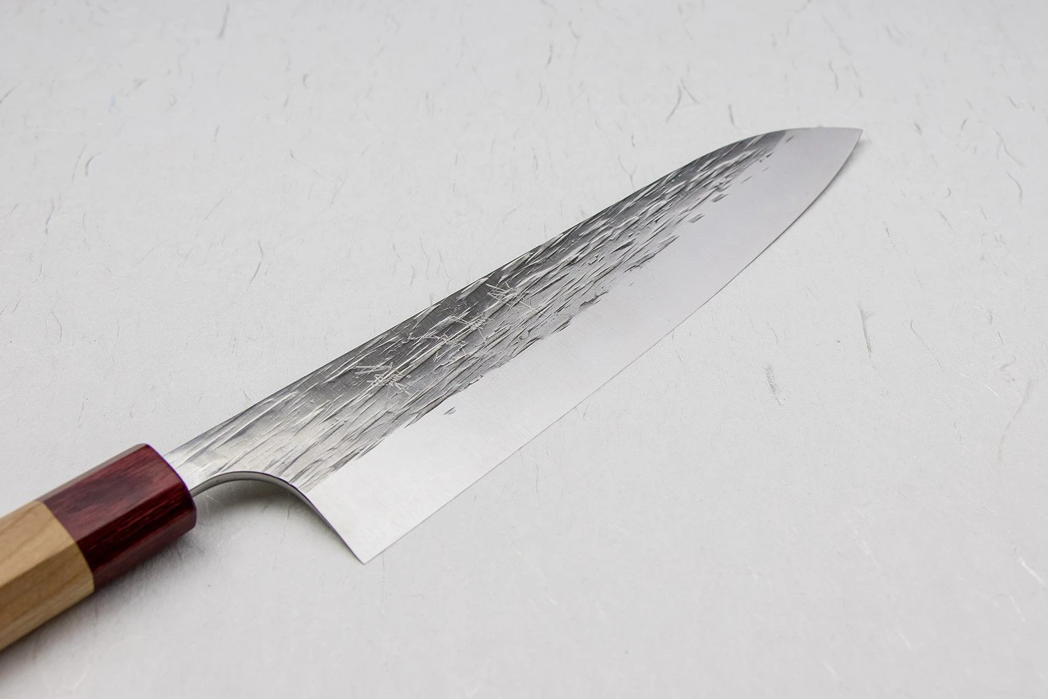The Yu Kurosaki Sasame line is remarkably gorgeous. The shiny Cobalt Special steel is the perfect canvas for Kurosaki-san’s expert hammering that lends it its eponymous finish. “Sasame” means bamboo leaf, and bamboo leaf is exactly what this line’s surface finish evokes.