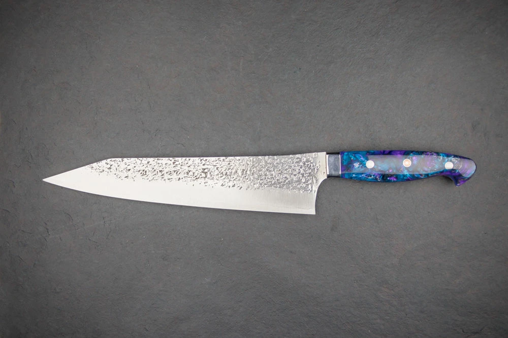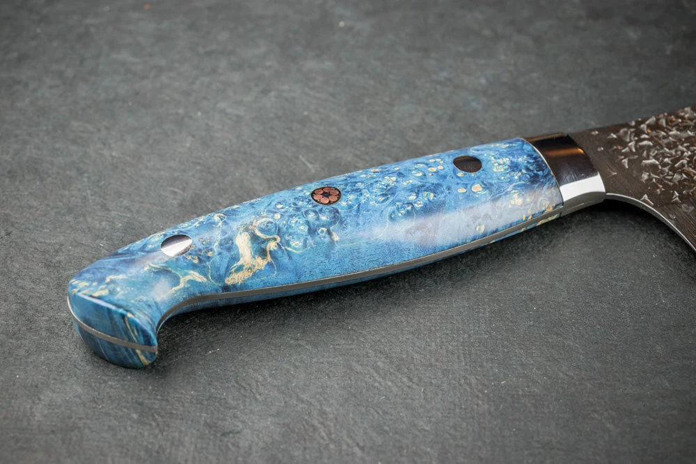 About the Shape – Inspired by the profile of a traditional European chef knife, Gyutos are a multi-purpose knife with a slight meat cutting bias. “Gyuto” translates to “cow sword.” If you want one knife to do it all, This is it. Starting at 180mm, Gyutos can reach the ridiculously long (and awesome) 370mm. For the at-home or professional cook, we recommend a Gyuto which measures between 210mm and 270mm long.